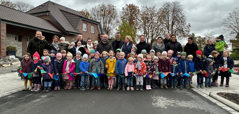 This means that the last of 5 construction phases in the Pflaumenallee development area has now been completed. This final section is home to 24 detached houses and the Zwergenhaus daycare centre, whose children had made special preparations for this day: a ribbon several metres long with self-designed colourful pennants was made to celebrate the inauguration of Dechant-Schepers-Straße.