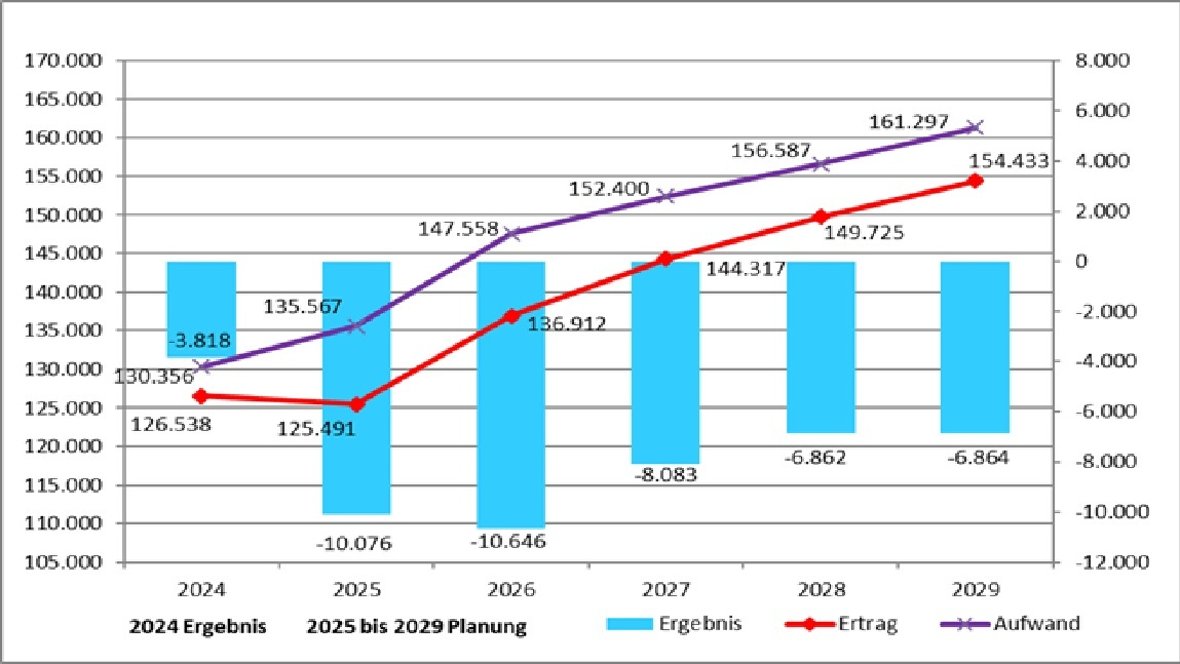 Bei der Entwicklung der Erträge und Aufwendungen ist durchgehend ein negatives Jahresergebnis zu erkennen. Die geplanten Jahresergebnisse betragen im Jahr 2026 -10.645.950 Euro, 2027 -8.083.050 Euro, 2028 -6.861.650 Euro und 2029 -6.864.150 Euro.