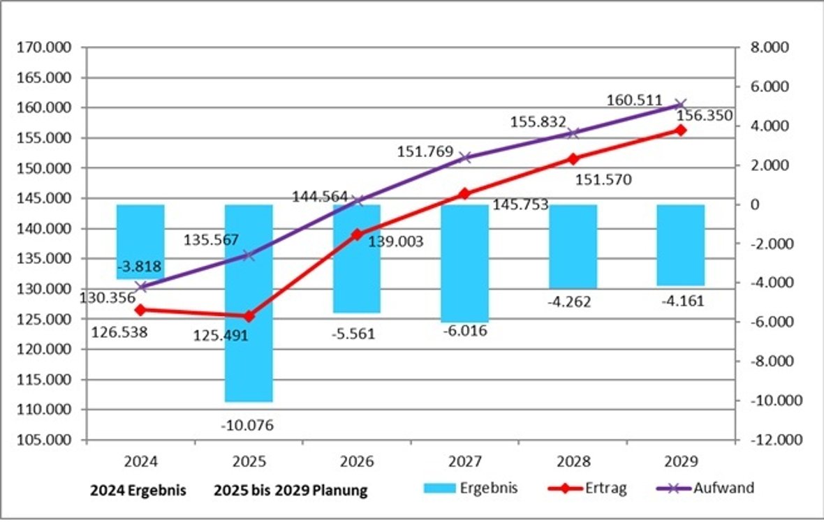 Bei der Entwicklung der Erträge und Aufwendungen ist durchgehend ein negatives Jahresergebnis zu erkennen. Die geplanten Jahresergebnisse betragen im Jahr 2026 -5.561.000 Euro, 2027 -6.016.350 Euro, 2028 -4.262.400 Euro und 2029 -4.161.650 Euro.