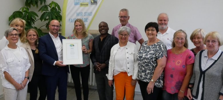 Dr. Antje Ruhmann, woordvoerder van de stuurgroep Fairtrade-Beckum, overhandigt het certificaat aan burgemeester Michael Gerdhenrich.Dit is de 4e keer dat de certificering als Fairtrade stad in 2017 is verlengd. "Sinds de eerste toekenning in 2017 hebben we als stad laten zien dat eerlijke handelsvoorwaarden niet slechts een ver ideaal zijn, maar lokaal in de praktijk kunnen worden gebracht," zei Michael Gerdhenrich tijdens de prijsuitreiking. "De hernieuwde certificering is een erkenning voor iedereen die dagelijks campagne voert voor eerlijke producten, evenementen organiseert, educatief werk verricht en het idee van eerlijke handel naar onze stad brengt en hier verder uitbouwt. Mijn speciale dank gaat hiervoor uit naar de stuurgroep!"