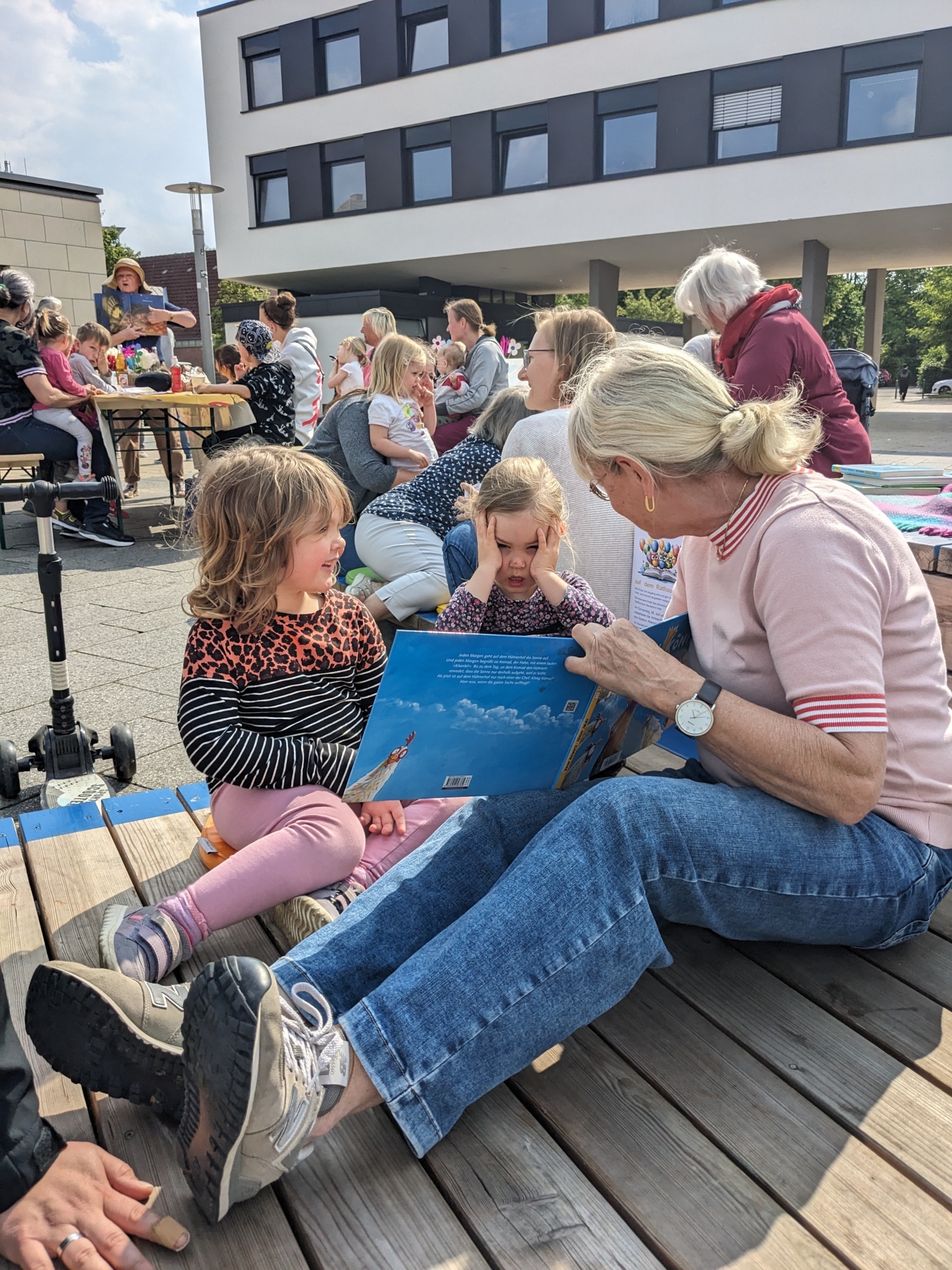 Viele Kinder kamen zum Lesevergnügen zu den Stadt-Terrassen. Und Bürgermeister Michael Gerdhenrich lud zum Austausch über das Verkehrsprojekt und andere Themen.