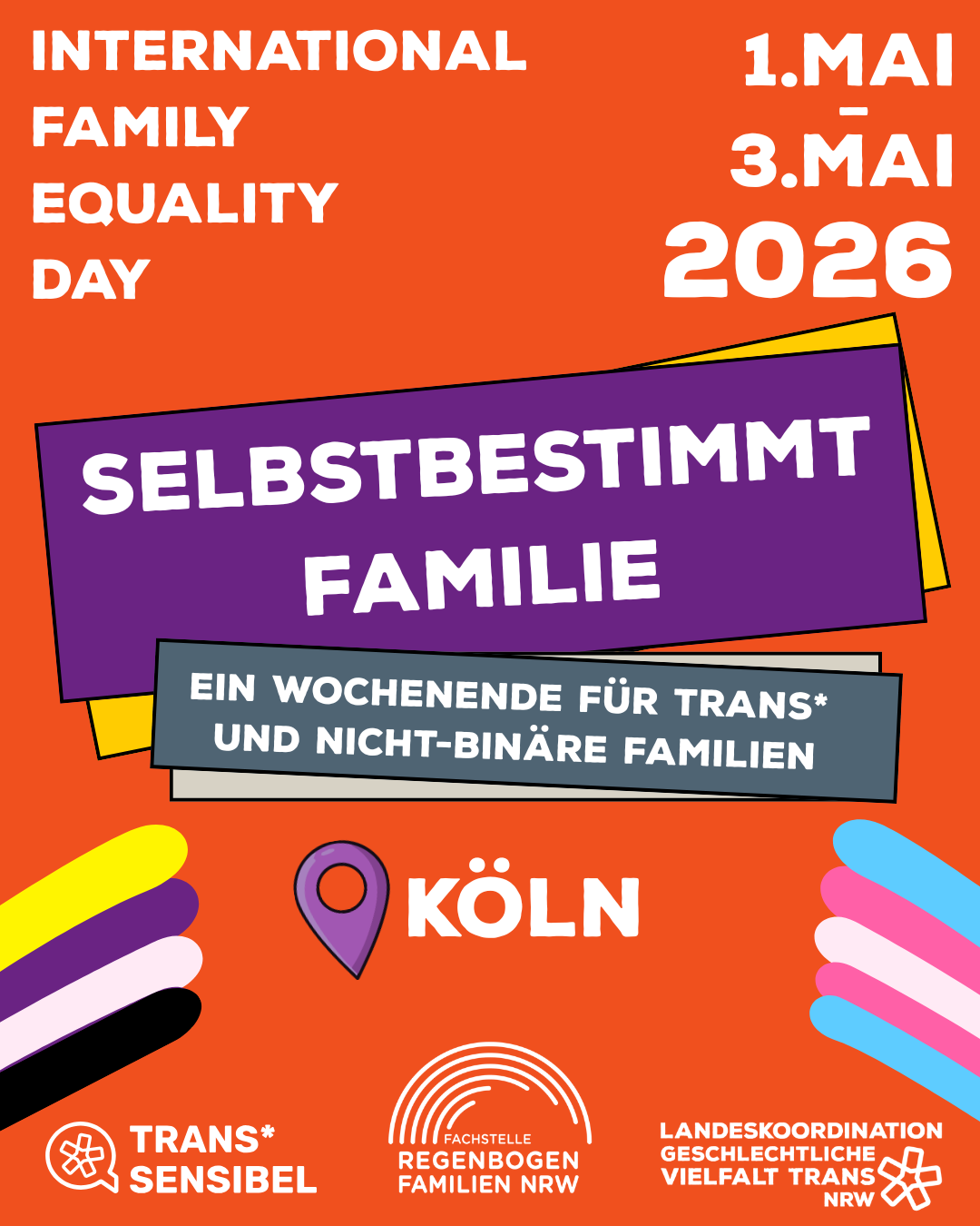 Die Fachstelle Regenbogenfamilien NRW bietet im letzten Quartal des Jahres verschiedene Fortbildungstermine an. Zielgruppen sind hierbei neben familiennahen Fachkräften, Jugendämter, Kommunen, Ganztageseinrichtungen, Hebammen, Gynäkologinnen und Gynäkologen, aber auch Personen aus der Stillberatung oder Doulas.