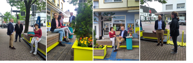 Die Stadt-Terrassen sind Ausleihmöbel, die das Zukunftsnetz Mobilität NRW kostenfrei zur Verfügung stellt, um Verkehrsfragen praktisch diskutieren zu können. Sie werden in der Hauptstraße, am Bahnhof und auf dem Rathausplatz stehen und sollen für zusätzliche Aufenthaltsqualität sorgen – unter anderem da, wo sonst Autos parken.