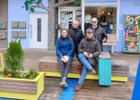 Erstes Platznehmen auf der Terrasse vor dem Stadtteilwohnzimmer für die Presse